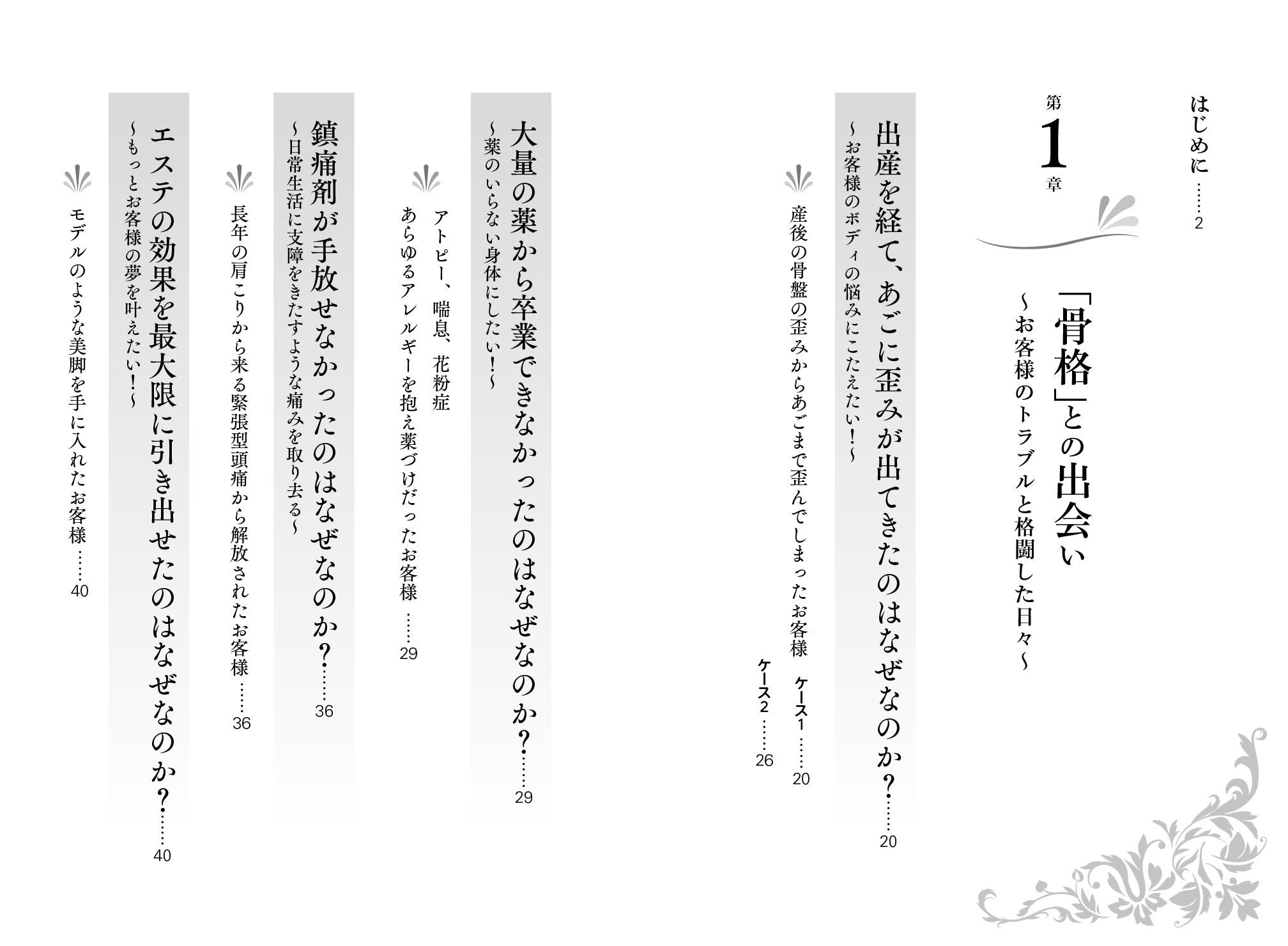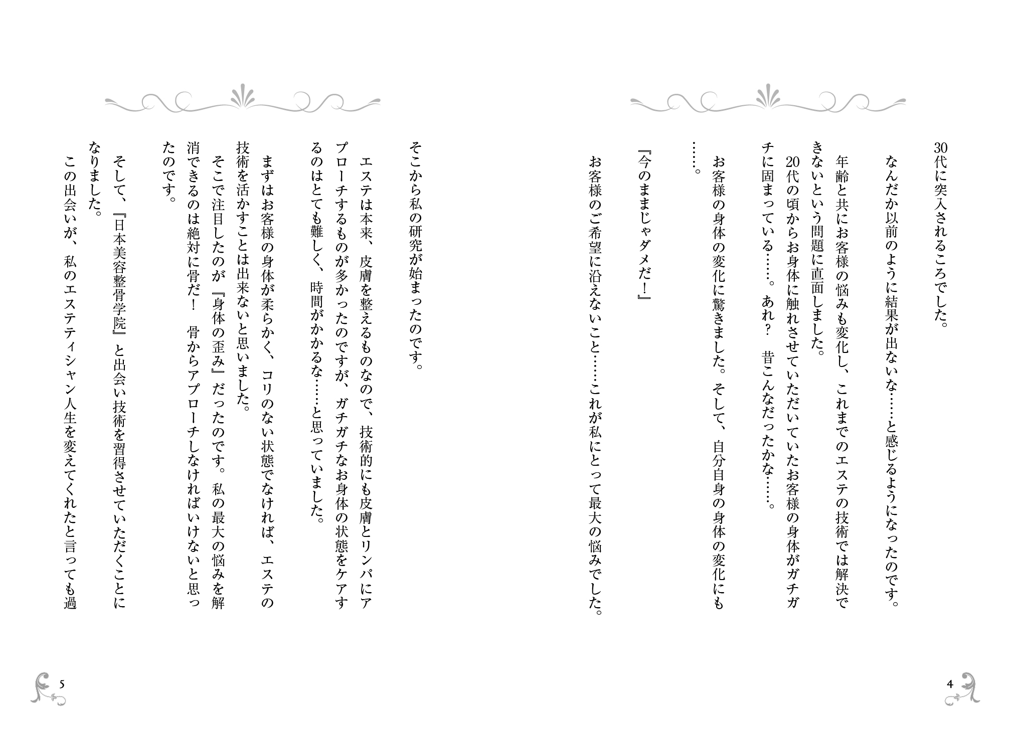 本書では、エステティシャンである著者がお客様のトラブルを解消するため、美容整骨師のダブルライセンスを取得し、