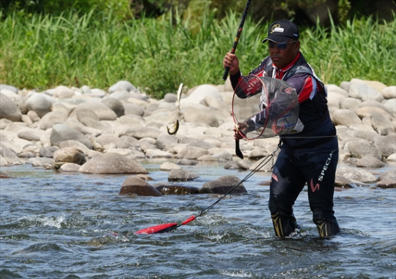 大型で有名な九頭竜川ですから切れない丈夫な仕掛けで挑みました。高切れでオトリを失っていては、いくら数を釣っても勝てませんからね。決勝戦では、谷川選手が入っていない筋を狙い、根掛かりを恐れずに大石などの際を"打って引く"を繰り返しました。そして、オトリが天然に変わるとすぐガツンと来ましたから、これはいけると確信しました。来年も「てっぺん」に立てるようにがんばります。