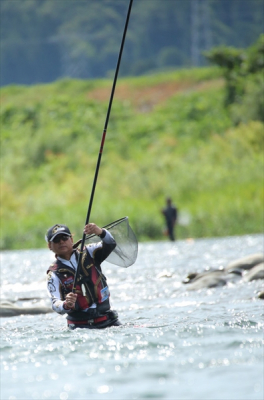 試合開始のホーンともにオトリを放つ両選手だったが、まず、下流に入った谷川選手が掛けた。しかし速い流れに邪魔されたのか身切れ。その後、大型と思われるアユを掛けたのだが、高切れでオトリまでも失ってしまう大きなロス。一方、楠本選手は試合開始後40分ではじめて掛けた。そしてオトリが天然に変わるやいなや2尾を連続して確保した。後半、瀬脇から流芯に狙いを変えてからは怒濤の連発。またもやトラブルに見舞われた谷川選手を尻目に合計13尾をマークし逃げ切った。