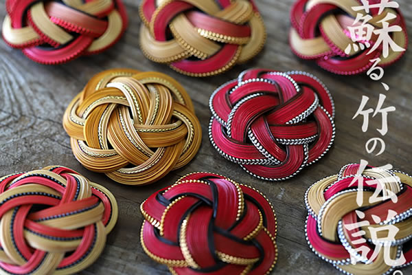 竹レトロブローチは形や色も様々。直径約5cmほどの小さな竹細工の中に藤で作られた小花が飾られていたり、直径1cmにも満たない小さな手毬をあしらったりと職人の技が集約しています。少し懐かしさを感じるレトロな竹ブローチをぜひご覧ください。