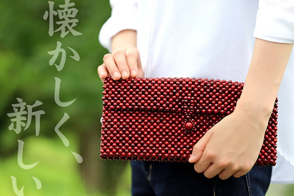 バッグはどちらのタイプも竹のビーズを繋ぎ合わせて作られています。竹を輪切りに削り出した平ビーズ、維管束の流れるような自然の模様を楽しめる縦長ビーズ、コロンと可愛らしい球体の小さな珠(たま)ビーズの3種類の竹ビーズ。竹本来の色味を楽しめるバッグに加え、緑や橙色など濃くしっかりと色付けされているものもあり、どことなく昭和の雰囲気を思い出させてくれます。懐かしくもあり、新しくもある。そんな新感覚のバッグでお出かけを楽しまれてはいかがでしょうか。