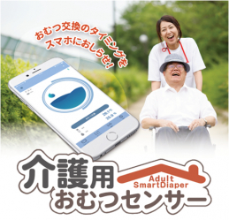 介護用おむつセンサーは、おむつにセンサーを付けることで、装着者が排泄をしたときの温度と湿度の変化を検知し、スマホに通知します。おむつの交換回数、排泄の回数をクラウド上に記録できるため、装着者の体調管理を簡単に行えます。