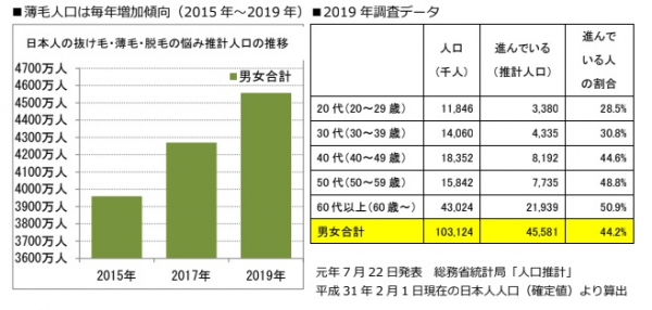 これは総務省統計局の人口推計から算出すると、日本国内の20歳以上で約4,558万人の方が抜け毛・薄毛や脱毛において悩みを抱えていることになります。