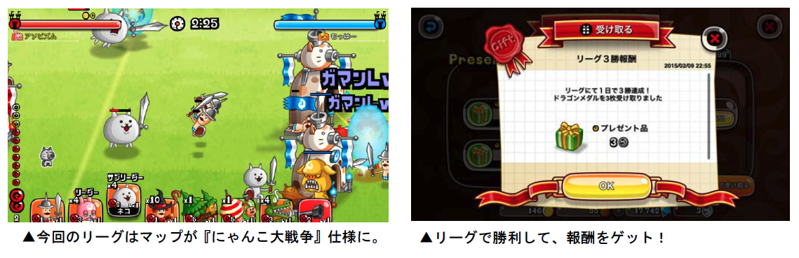 上記期間中、リーグのマップが『にゃんこ大戦争』仕様に変化し、ネコの能力値(攻撃力・防御力・HP)が上昇します。