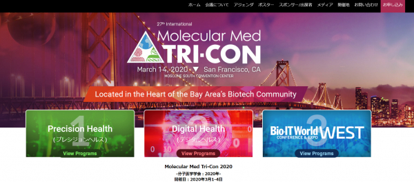今度で27年目を迎えるInternational Molecular Medicine Tri-Conferenceは、個別化医療の分野で最大級の規模を有する総合イベントの1つであり、製薬会社やバイオテクノロジー企業、研究機関で創薬や開発、診断法、インフォマティクス、デジタルヘルスに関する革新的な研究に携わっているオピニオンリーダーなど3,100人以上の参加者が集まります。