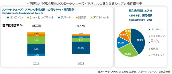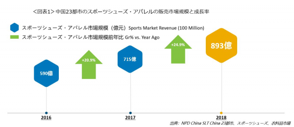『Japan Sports Tracker※1』では、スポーツに使われている、またはスポーツ用に販売されているシューズとアパレルの消費者購入動向を世界16カ国で継続して毎月調査しています。中国23都市における2018年のスポーツシューズ・アパレルの市場規模は893億元(日本円で約1.3兆円)で、前年同期比で25%増の大幅成長でした(図表1)。日本における同市場規模は、1.06兆円で成長率は2%増でしたので、中国での成長がいかに大きいかが分かります。