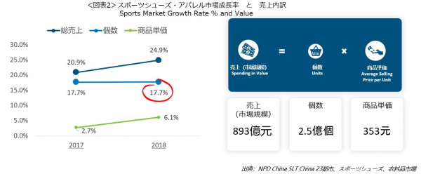 中国スポーツシューズ・アパレルの市場規模の内訳をみると(図表2)、2018年の販売個数は2.5臆で平均商品単価は353元(日本円で約5,269円)でした。同年の成長率を販売個数と平均商品単価別にみると、販売個数の成長率は17.7%、平均商品単価は同6.1%で、販売個数の増加が市場規模の成長により寄与していることが分かりました。