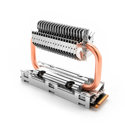 Frostbitは、M.2 NVMe SSD用のヒートシンクです。独自のデュアルスタックヒートパイプと可動式構造により、特徴的な形状でありながらCPUクーラーやグラフィックスカードとの干渉を回避、ケース内部に発生するエアフローを受けてM.2 NVMe SSDを冷却し、サーマルスロットリングの発生を抑制します。