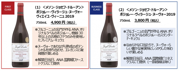 今年の解禁日11月21日当日、ANA国際線ファーストクラス(全路線)において「メゾン・ジョゼフ・ドルーアン ボジョレー・ヴィラージュ・ヌーヴォーヴィエイユ・ヴィーニュ2019」を、ビジネスクラス(一部路線を除く)では「メゾン・ジョゼフ・ドルーアン ボジョレー・ヴィラージュ・ヌーヴォー2019」をご提供いたします。また、羽田空港および成田空港のANA SUITEラウンジ内でも解禁日当日に振る舞う予定です。