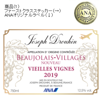 毎年ご好評をいただき完売となるANAオリジナルラベルは、今年も、ブルゴーニュの名門「メゾン・ジョゼフ・ドルーアン」の2銘柄を採用。オリジナルラベルのボジョレーを同ワイナリーが公式に提供しているのは、世界で唯一ANAのみ。ラベルはANAロゴと飛行機、葡萄のイラストをあしらった上品なデザインに仕上げ、ボトルにはANAファースト/ビジネスクラス採用の証「ファースト/ビジネスクラスステッカー」が貼られています。