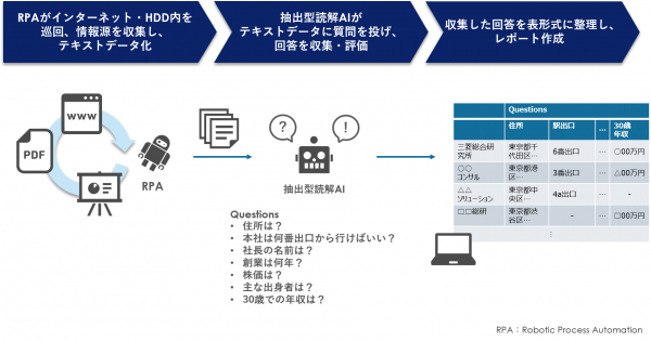 両社はこの共同研究において、文章に対する質問の回答を自動抽出する技術(抽出型読解AI技術)、およびその抽出型読解AI技術を用いて、インターネット検索を行う際に大量の文章データの中から求める答え(情報)を自動収集する技術(自動情報収集エージェント技術)を2019年3月に開発しました。