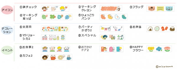 記念日や大切な日を目立たせる<旗チェック>など「アイコン柄」5種、余白をかわいくデコる<パーティかざり2>などの「デコレーション柄」5種、楽しい予定に<お食事2>などの「イベント柄」4種で構成された計14柄。毎日の予定をより一層楽しく、かわいく管理できます。