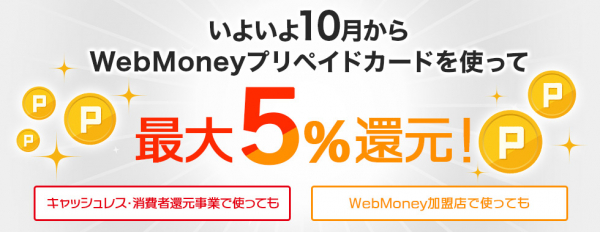 「WebMoneyプリペイドカード ポイント還元特典」は、これまでWebMoney加盟店でのご利用分について、0.5%(入会後3ケ月は1.0%)のポイント還元をしてきましたが、今般の還元事業の開始に合わせて、2019年10月から2020年6月までポイント還元率を一律5%にアップします。
