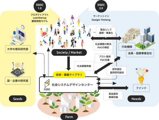 そこから4年が経過した今、顧客のあらゆる要望に対し IT 技術を駆使し応えることができる JBS ならば、これまで培った知見を世の中の課題解決に更に役立てていけるのではないか、と考えました。そのために、日本を代表する研究者と同じベクトルで協力しあい、世界に誇る IT 企業やコンサルティングファームとのパートナーシップを通じて産学連携を強化することで、より世の中のバージョンアップに貢献したいと決意し、今回新たに「一般社団法人社会システムデザインセンター」(=SSDC 2.0)を設立しました。これまでの経験を活かしてメンバーシップ企業や学生、科学者と一層の協力体制を敷き、プロダクトアウトの手法だけでなく、マーケットインの考えをベースにした事業創造プロセスを用い、新しいプロダクトや課題をともに解決してまいります。