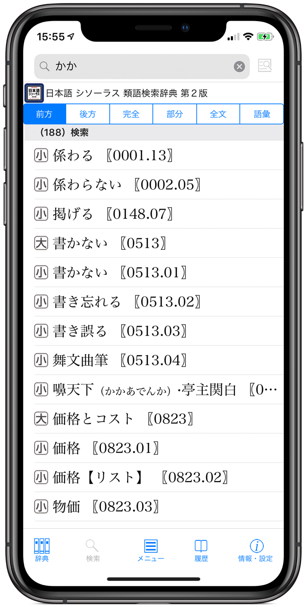 ●豊富な検索オプションを用意(前方一致 / 後方一致 / 完全一致 / 部分一致 / 全文検索)。それぞれの検索方法で、文字を入力すると候補見出し語が表示されるインクリメンタルサーチに対応。(部分一致・全文検索を除く)用語をうろ覚えでも検索が容易です。