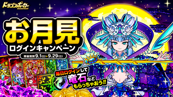 株式会社アソビズム(本社:東京都千代田区、代表取締役:大手智之)は、App Store・Google Playにて好評配信中のリアルタイム合体カードバトル『ドラゴンポーカー』で、2019年9月1日(日)より「お月見ログインキャンペーン」を開催いたします。