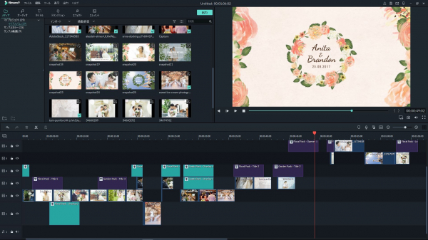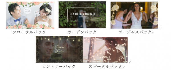 Filmora9×Weddingは、華やかなフローラルパック、爽やかさあふれるガーデンパック、ハイセンスなゴージャスパック、ナチュラルなカントリーパック、そして表情の輝きを上品に引き立てるスパークルパックと選べる5つのテーマを搭載、あなた好みの世界観を演出します。特別な一日にむけてさっと手軽にハイセンスな動画を作りたいという方にも、また大切な人に贈るこだわりのムービーを作りたい方にもおすすめの製品です。2人のラブストーリーを伝える自作プロフィールムービー、会場を盛り上げる余興ムービーや感謝の気持ちを伝える披露宴エンドロールまで。初めての動画編集でも安心、充実の編集機能で2人の特別な日を演出します。
