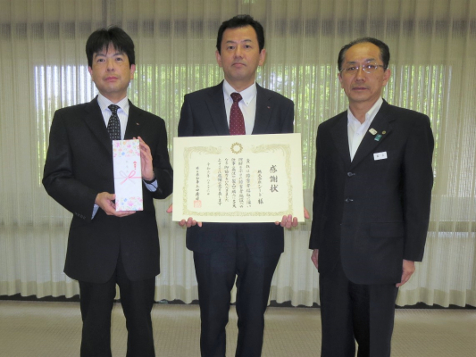 右より、埼玉県福祉部長 知久 清志 様、(株)シード 取締役常務執行役員 生産技術本部長 福田 猛、総務部 副部長 小川 裕昭