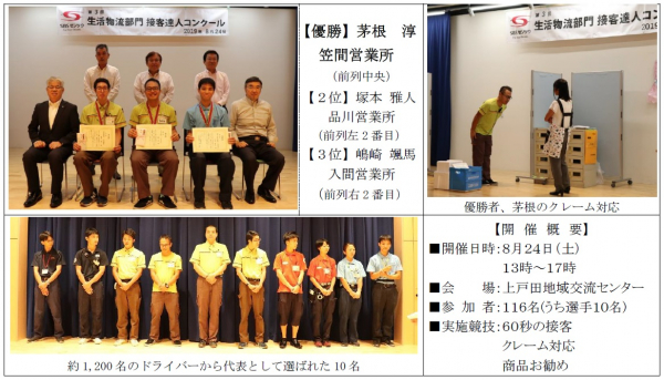 当社は、接客スキルを披露し磨きをかける場として本年で3回目となる「生活物流部門 接客達人コンクール」を開催いたしました。参加した選手は、全国64か所の営業所、約1,200名のドライバーから予選会を通じて選ばれた男女10名です。