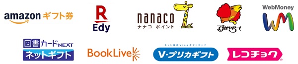 交換商品:全9種類(Amazonギフト券、楽天Edy、nanacoポイント、すかいらーくご優待券、WebMoney、図書カードネットギフト、BookLive!プリペイドカード、Vプリカ、レコチョク)