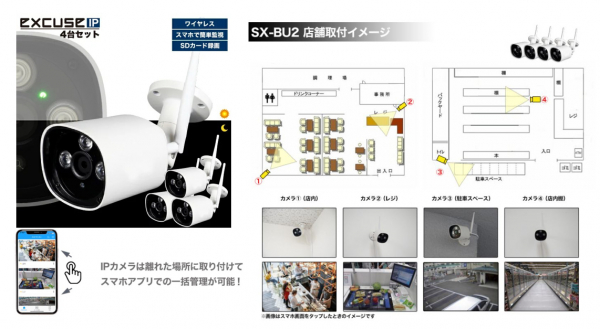 車載機器専門店のECサイト【液晶王国】を運営している株式会社 OTOGINO(オトギノ:代表取締役社長 鬼武公洋 本社 大分県日田市北友田 2 丁目 2123 番地 1)は、スマホ片手で防犯管理できるワイヤレス防犯カメラ(excuse IP) 4台セットを販売致します。家庭から事務所や飲食店、駐車場など、ケーブル工事なしで簡単に設置できます。