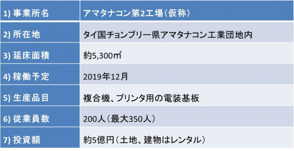 今般のタイ第2工場建設による生産能力増強は、当社の既存顧客からの増産要望ならびに新規顧客からの受注に対応するものです。長期化が懸念される米中貿易問題の影響を回避した中国からアセアン地域への生産移管の動きも視野に入れ、操業開始後2年内に売上高100億円を目指します。