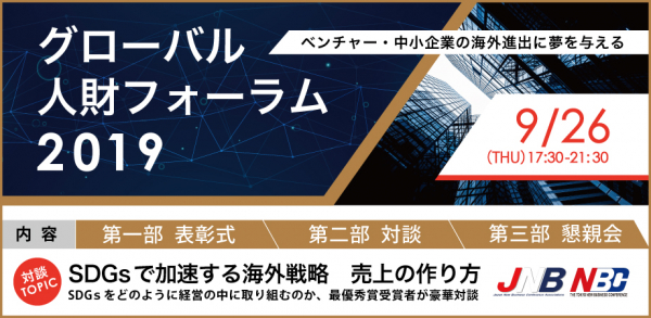 ニュービジネスやベンチャー企業の振興と育成に寄与する一般社団法人東京ニュービジネス協議会(略称:NBC、所在地:東京都港区赤坂、会長:下村 朱美)と公益社団法人日本ニュービジネス協議会連合会(略称:JNB、会長:池田 弘)共催による「第7回グローバル人財フォーラム2019」の開催が決定しました。