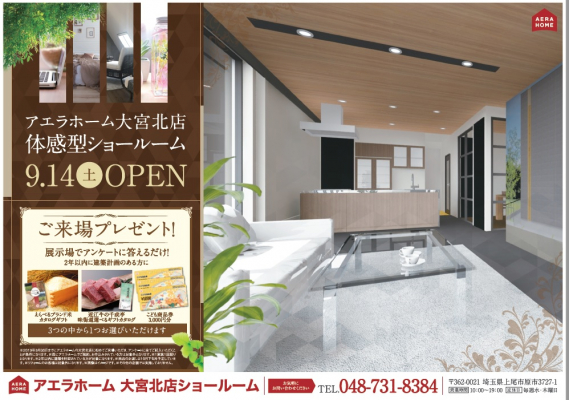 「環境設計の家」を掲げて、注文住宅の販売やFC事業、リフォーム事業を展開するアエラホーム株式会社(以下:アエラホーム 東京都千代田区/代表取締役社長 中島鷹秀)は、2019年9月14日(土)埼玉県上尾市に新しく体感型の「大宮北店ショールーム」をオープンいたします。
