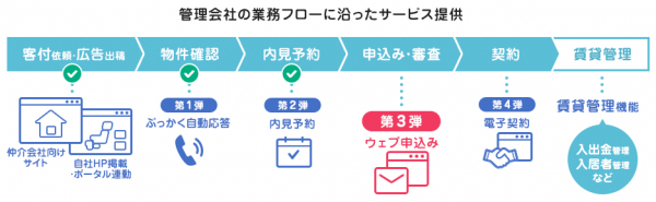 一般に物件が空室となると、まず自社ホームページやポータルサイト・業者間サイトに物件情報を掲載して募集を開始し、その後物件確認・内見予約対応を経て、申込みとなります。これまで、各媒体への掲載をカバーするシステムや、物件確認対応以降をカバーするシステムはありましたが、その両者をワンストップで管理できるサービスは存在しませんでした。
