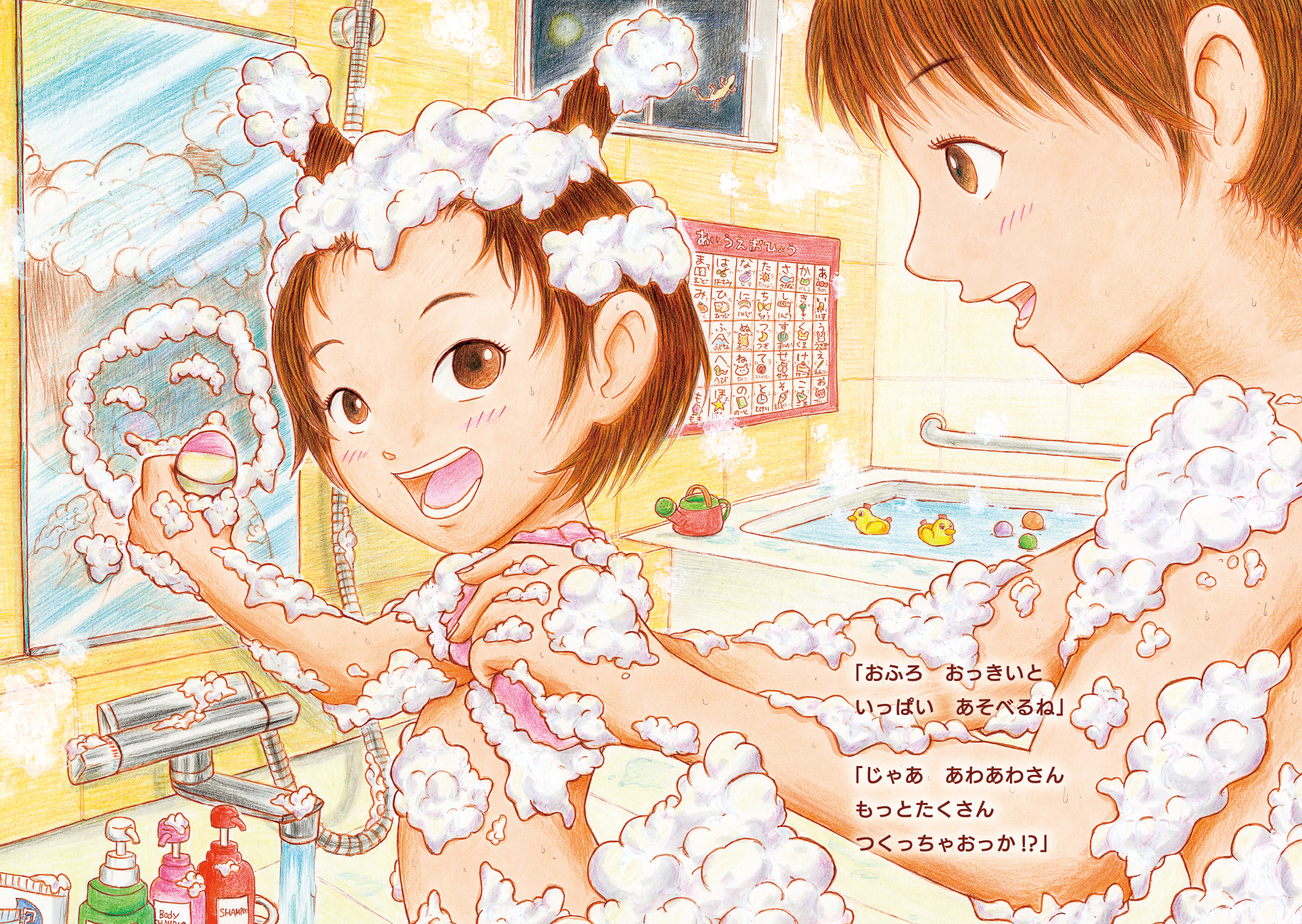 おおきなおふろでママとあわあわをつくったり。たのしいまいにちを過ごします。