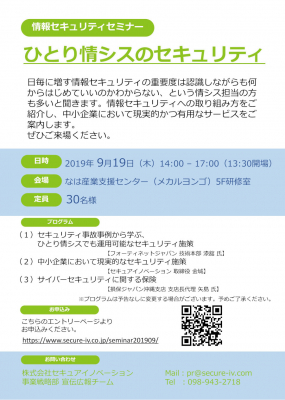 株式会社セキュアイノベーション(本社:沖縄県那覇市上之屋、代表取締役社長 栗田智明、以下「当社」)は、沖縄県内で中小企業の情報システム担当者を応援するセミナー「ひとり情シスのセキュリティ」を開催いたします。