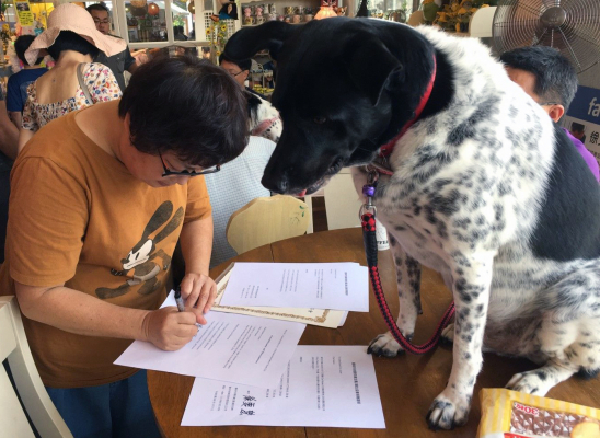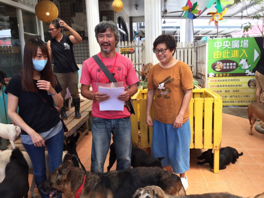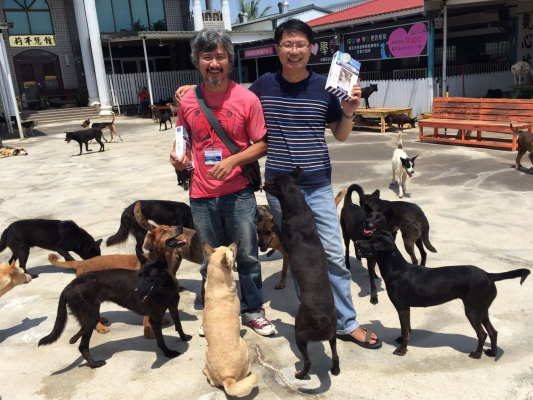 園長のMrs.Hsuと跡継ぎの息子さんは台湾の台南市で非常に清潔で楽しいシェルターを経営し、捨て犬を現在3500匹引き取り、大勢のスタッフを雇って、愛情いっぱいで世話をしている。園長と息子さんは、世界的にも有名な動物愛護家。Fishy Flakes寄付の日も園内は台湾中のペットフアンでにぎわいを見せていた。