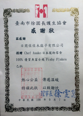 園長は、AsakoSasaki Inc.のFishy Flakesを非常に喜んで、感謝状を発行してくれた。また、温かくAsakoSasaki Inc.台湾支店のアポロ・リー氏と楊氏を受け入れ、二人はMrs.Hsuの動物に対する深い愛と社会貢献の実際を体験することができた。