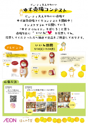 「心からほっとする健康と癒し」をコンセプトに商品を展開する株式会社ほんやら堂(本社:群馬県高崎市 代表取締役:藤永辰美)とイオンリテール株式会社は9月10日(火)から本州・四国の「イオン」「イオンスタイル」のうち、33店舗の化粧品売場で「ゆずの柴ずきん」を使った売場づくりコンテストを行っています。