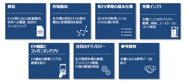 本書はEV動向をまとめたレポートとモデル別データベースファイルの2部構成になります。レポートでは充電インフラ、ビジネスモデル、環境への影響、関連政策やEVがもたらす現在および今後の機会についてまとめ、EVモデル別データベースでは仕様や特性を一覧にし、検索および比較することができます。