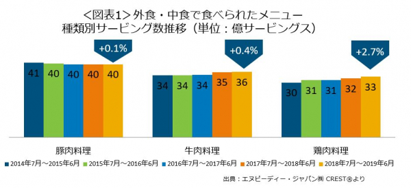 外食・中食市場情報サービス『CREST(R)*1』を提供するエヌピーディー・ジャパン株式会社(東京都港区、トーマス・リンチ代表)は、外食・中食市場における、肉の種類別喫食動向分析レポートを2019年9月17日に公表します。