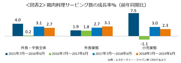 鶏肉料理の業態別のサービング数の2018年7月~2019年6月計における成長率(図表2)をみると、外食業態(クイックサービスレストラン、フルサービスレストラン計)で3.1%増、小売業態で2.3%増といずれの業態でも増加したことが分かりました。
