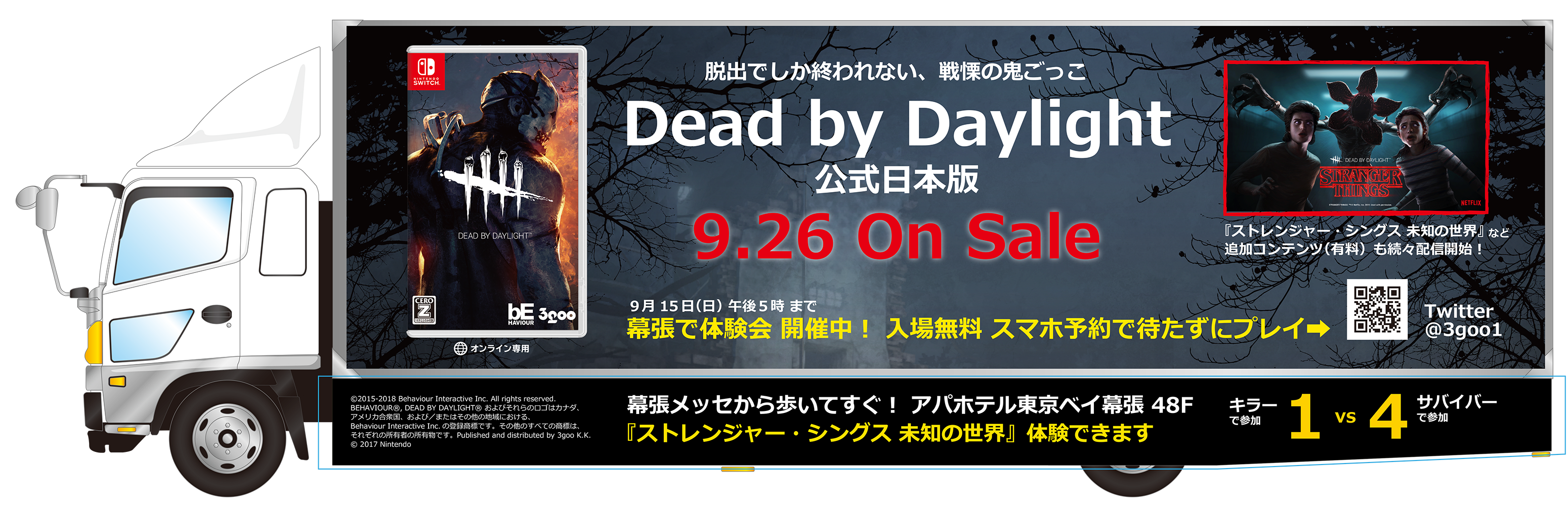 株式会社3goo(サングー)(本社:東京都渋谷区、代表取締役:ディ コスタンゾ ニコラ)は、本日9月12日、9月14・15日開催の『Dead by Daylight公式日本版リリースパーティー』において、『Dead by Daylight』の次期チャプターとして注目を集めるNetflixオリジナル作品『ストレンジャー・シングス 未知の世界』チャプターを、今回のイベント用に特別に用意された体験版として公開することを発表いたします。コンソール版としては世界初の一般公開となります。また会期中は、会場周辺においてDead by Daylightのアドトラックの走行も行われます。