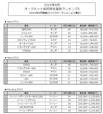 情報流通支援サービスの株式会社オークネット(本社:東京都港区/社長:藤崎清孝)は、2019年8月度のオークネットバイクオークションにおける成約台数を集計し、排気量別ランキングベスト5をまとめました。