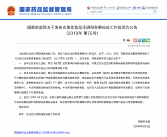 国家薬監局による化粧品登録及び備案検査業務実施規範の発布に関する公告