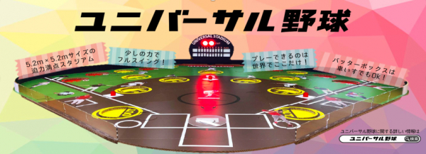 ユニバーサル野球は、例えば車いすのままでもバッターボックスに立てる、オリジナル開発のスタジアム「ユニバーサルスタジアム」を使います。ユニバーサルスタジアムは開発に開発を重ね、今回が三号機です。本塁からセンターフェンスまでは6mあり、市販の野球盤(約60cm)の10倍の直径で、一般的な野球場(120m)の20分の1に当たります。強化ダンボール製で、車一台で簡単に運べて、少ない人数でも短時間で組み立てられる構造になっています。障がいのある人もない人も同時に楽しめるスポーツを目指して開発し、2020年の本試合大会の実施を目指しています。