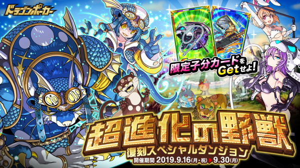 株式会社アソビズム(本社:東京都千代田区、代表取締役:大手智之)は、App Store・Google Playにて好評配信中のリアルタイム合体カードバトル『ドラゴンポーカー』で、2019年9月16日(月・祝)より復刻スペシャルダンジョン「超進化の野獣」を開催中です。