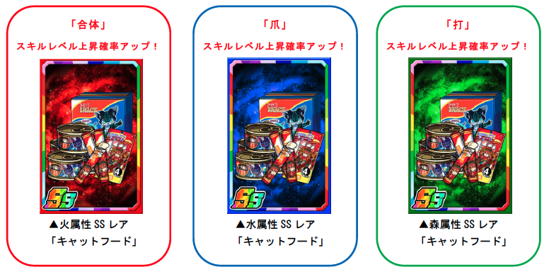 「野獣P」を使い素材ガチャを回すと、限定の強化素材「キャットフード」を手に入れることができます。限定強化素材「キャットフード」は一部のモンスターに使うと強化値2倍の効果があるほか、合体スキル・爪スキル・打スキルのスキルレベル上昇確率もアップします。