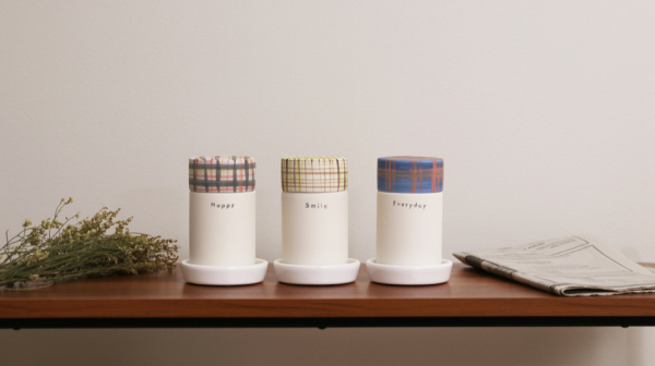 やさしい色合いのチェック柄の蓋がちょこんと乗った可愛い陶器のカップ。