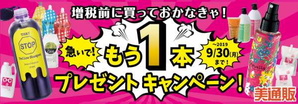 「必要な備品は増税前に購入しておきたい」、「サービスの質は落とさずに少しでもコストを抑えたい」そんなサロンオーナー様は多いことでしょう。「美通販」では、増税前のサロン応援企画の一環として、「プラスワンキャンペーン」を行うことで、多くのサロン様の後押しをしていきたいと思っております。キャンペーンは2019年9月30日(月)まで開催しますので、この機会に多くのサロン様にご利用いただき、経費節減・利益率アップ、そして消費税UP対策のお役に立てていただきたいと考えております。