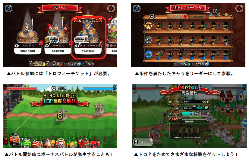 上記期間中、「トロフィーバトル」の全モードを対象に、勝利すると1日3回まで“1000/200/150/100”の「トロP」がランダムで獲得できます。