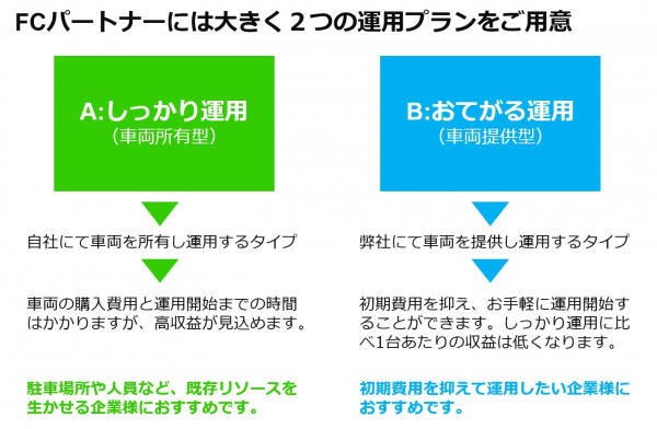 リソースの確保からまったくの新規事業としてスタートされる企業様も歓迎しております。初期費用を抑え、お手軽に運用開始できる車両提供型の「おてがる運用」もご用意しております。