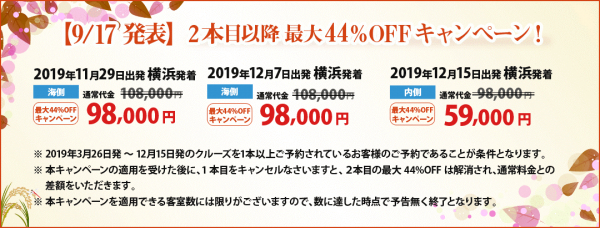 2019年の日本発着ダイヤモンド・プリンセスにお申し込みのお客様を対象に、11月12月の対象コースを最大44%オフの割引料金でご案内いたします。