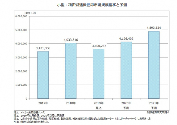 株式会社矢野経済研究所(代表取締役社長:水越孝)は、小型・精密減速機世界市場を調査し、出荷動向・予測、関連企業の動向、将来展望を明らかにいたしました。