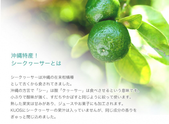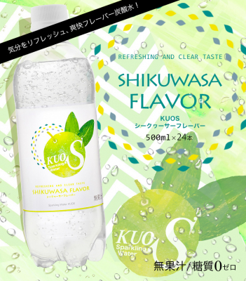 その純水仕込みの強炭酸水クオスにシークワーサフレーバーを加えたすっきりとした酸味を感じる爽やかな炭酸水です。沖縄の方言で「シー」は酸、「クワーサー」は食べさせるという意味です。小ぶりで酸味が強く、すだちや、かぼすと同じように絞って使います。KUOSにシークワーサーの果実は入ってませんが、同じ成分の香りをぎゅっと閉じ込めました。